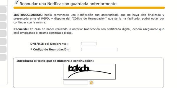 Si ya has iniciado una notificación anteriormente, puedes continuar cumplimentándola más tarde. Para ello, has de escribir tu DNI y tu Código de Reanudación y rellenar el captcha. El código de reanudación lo obtendrás una vez rellenes los datos del Responsable del Fichero (que es el punto 1. de la inscripción de ficheros y que verás un poco más adelante).